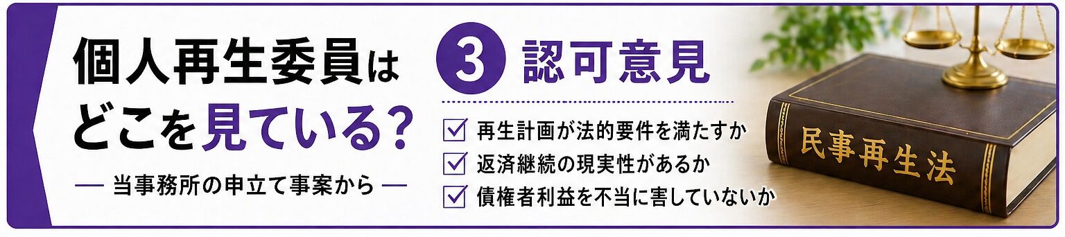 今回は、いよいよ最終の意見(認可意見)の審査について、当事務所の申立て実例をもとに、個人再生委員が検討した事項をご紹介します。